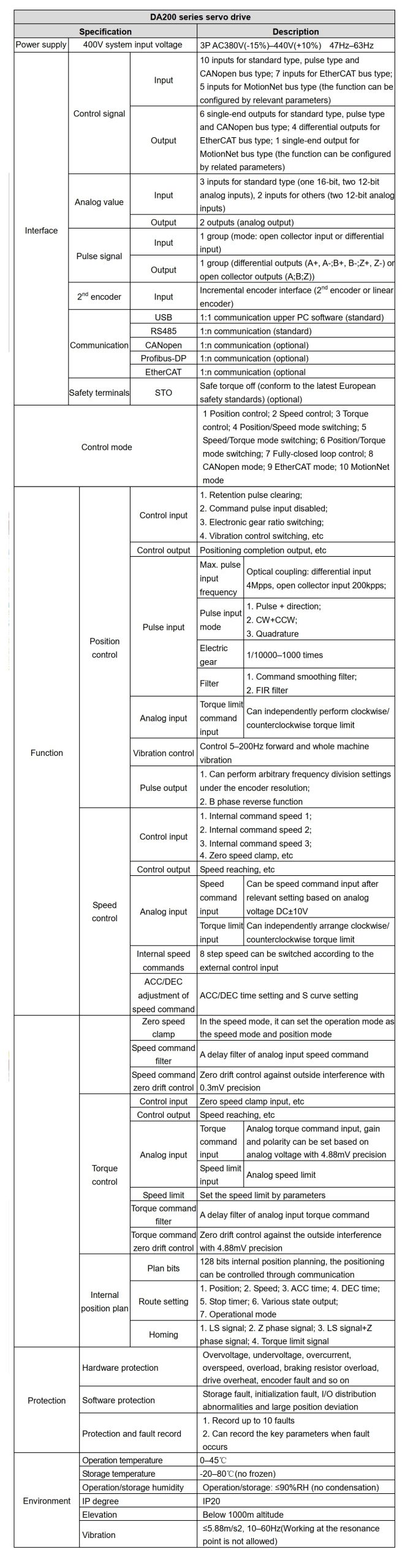 سروو درایو DA200 دارای مدهای کنترل پوزیشن، کنترل سرعت، کنترل گشتاور، پوزیشن/سرعت قابل تعویض، سرعت/گشتاور قابل تعویض، پوزیشن/گشتاور قابل تعویض میباشد. این سروو درایو با پشتیبانی از شبکه ارتباطی Modbus، CANOpen و EtherCAT و PROFINET و همچنین با داشتن آپشنهایی از قبیل ECAM داخلی، سیستم شناسایی اینرسی به صورت آنلاین و آفلاین، ناچ فیلترها، کنترل نقطه به نقطه PTP (پوزیشن داخلی) و … کمک شایانی به مهندسین حوزه اتوماسیون صنعتی نموده است.